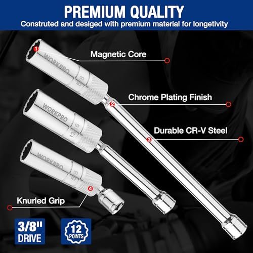 - Set Includes: WORKPRO Magnetic Swivel Spark Plug Socket Set is 3/8-inch drive and includes the following: 1PC 14mm 4-inch Extension Thin Wall Socket, 1PC 9/16-inch 6-inch Extension Socket, 1PC 5/8-inch 4-inch Extension Socket,1PC 13/16-inch 6-inch Extension Socket,1PC 5/8-inch 11-inch Extension Socket, 1PC 9/16-inch Socket, 1 PC 9/16-inch Socket. Long and short spark plug sockets can meet your needs in different scenarios