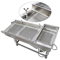 【With One Layer of Screen】The mesh size of the screen is 0.28inch(7mm). Screen size is 30cm*75cm(11.8*29.5inch). The screen is screwed to the machine, which is very tight. 【Fast and Stable Shaking】The Vibrating Sieve Machine has a powerful copper core motor. Four springs with good elasticity equipped to stably transmit vibration. One layer shaker has 2 discharge holes, with big size to improve efficiency. 【Made of Stainless Steel】The shaking machine is made of stainless steel, easy to clean, durable and with good looking. 【Adjustable Vibration Amplitude】The vibration amplitude of the sieve machine can be changed by adjusting the vibration force of the vibration motor. 【Application】The stainless steel linear vibrating screen is widely used in mining, coal, electric power, metallurgy, building materials and other industries for large block materials, medium and small granular materials.
