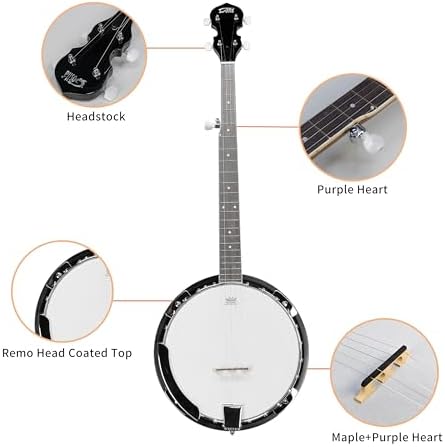 HIGH-QUALITY REMO DRUM HEAD Selected banjo panel will produce a sweet tone, ensuring clarity sound. Proper bridge setting can stay stable when fast fingerpicking SUPERIOR MATERIAL Purple Heart fingerboard and bridge, sturdy and stable, make the sound more layered. Sapele sides and back have beautiful wood grain, hard and not liable to warp or corrode, making the banjo durable GEARED 5TH TUNER It is important for both tuning and playability, bringing you the classic tones and perfect for country, folk, bluegrass and even some modern rock. And it is an important upgrade over the common friction tuner THICKENED BAG for BETTER PROTECTING An thicker bag will protect the banjo better, making it a great idea to take for traveling, camping, hiking, going to the beach. And also perfect for anyone who has always wanted to learn to play this iconic instrument
