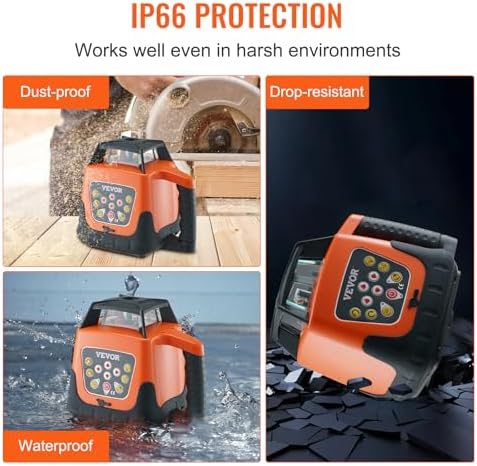 - Premium Material: Our user-friendly rotary laser level gives you peace of mind with its IP66 rating. It features a rugged, high-impact composite housing that protects the internal mechanism from water and dust, ensuring long-lasting reliability even in tough conditions. To make things even more convenient, we've included a sturdy carrying case for easy organization and effortless transportation.