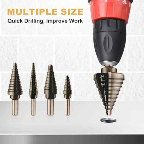 - Multiple Size Step Bit - The step drill bit set including 5 standard step bits, which you can drill 50 different kinds of diameter hole, which can meet your daily needs. Please mark the spot that you will to drill for easier drilling and improved drill bits life. Each unibit step bit optimally fits into power tools such as impact drill chucks securely and eliminates slip for higher efficiency of output.