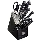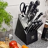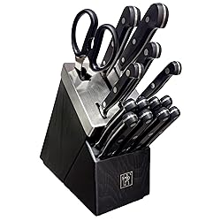 VERSATILITY: The Henckels International Classic 15-piece Self-Sharpening Knife Block Set is stocked with tools to easily tackle every kitchen task. The hardwood block features 14-slots for some of the best tools in the kitchen trade: a 4” paring knife, 5” serrated utility knife, 5.5” prep knife, 7” Santoku knife, 8” chef’s knife, eight 4.5” steak knives, and kitchen shears. For your convenience, these tools are dishwasher safe. Best of all: the block is self-sharpening. USE: The Paring Knife features a short blade and is wonderful for paring fruits and veggies by allowing you to cut right along the skin of the food. The versatile Chef’s Knife is useful on everything from small veggies to meat. The Serrated Utility Knife is perfect for cutting fruits, veggies and small pieces of fish and meat. The all-purpose Santoku Knife is perfect for all types of chopping and slicing. And there isn’t much you can’t mince, dice or slice with the Prep Knife. BONUS: The handsome hardwood block keeps this useful knife collection within reach on your countertop. The self-sharpening slots boast built-in ceramic honing wheels that automatically sharpen when knives are stored or removed. The remaining slots are for serrated knives, whose toothed blades never need sharpening. In addition to the specialty knives, this set comes with and stylishly stores six steak knives and a pair of kitchen shears, which are handy and versatile in cooking tasks. HANDLES: With the ergonomic, traditional triple-rivet handle, enjoy maximum maneuverability and fatigue-free cutting. Curved for comfort, the break-proof, triple-rivet handles are pleasant to grip, giving you the control you need to slice through tougher cuts with ease. With a seamless transition from blade to handle, the knives' fully forged construction provides wonderful balance. QUALITY: Since 1895, Henckels International has been making high quality, everyday knives at an exceptional value. Fabricated from high-quality stainless steel, the single-piece, precision-stamped knife blades are lightweight without sacrificing strength and durability. Honed for long-lasting sharpness, the fine-edge blades boast precision cutting.