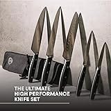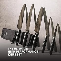 OFFICIAL KNIVES FROM THE SHOW: This exclusive knife set is used by the contestants in the US edition of MasterChef from Season 12 onwards. HIGH CARBON STAINLESS STEEL: Made from high quality high carbon stainless steel, these knives are built to last and offer exceptional sharpness and durability. They are sharpened by hand to ensure razor-like cutting precision. TRIPLE RIVETED FOR BALANCE: These knives are expertly triple riveted, with stainless steel bolsters ensuring a perfect balance between handle and blade for precise and comfortable handling. CANVAS ROLL INCLUDED: The set includes a handy canvas roll bag to store and protect your knives when not in use. This ensures your knives stay in top condition and ready for your culinary adventures. VERSATILE 5-PIECE SET: The 5-piece knife set includes essential kitchen tools such as a chef's knife, a Santoku knife, a utility knife, a paring knife and a carving knife. It's the perfect gift for both fans of the show and cooking enthusiasts alike.