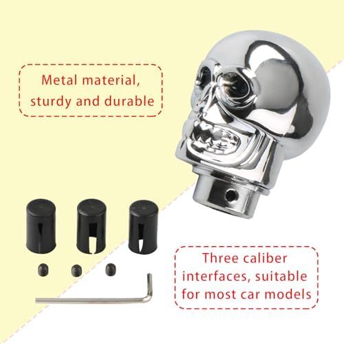 - Easy to Use: The package contains 1 x skull gear knob, 1 x hex wrench, and matching adapter. This product is easy to install and doesn’t take too long. All you have to do is remove the old shift knob, select the appropriate adapter size, use a hex wrench to tighten the small screw, and then screw the aluminum cover back on.