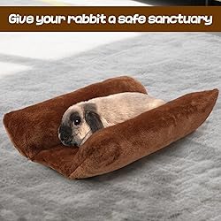 Unique Design: The 2 sides of the rabbit bed are filled with high-quality cotton, creating a plush, pillow-like area where your rabbit can rest comfortably. 5mm thick sponge pieces are used in the center, providing your rabbit with a snug and warm feeling, like being wrapped in a cozy hug. Soft & Comfortable: Crafted from flannel material, our bunny cuddle bed is soft, skin-friendly, and durable. It won't shed, ensuring comfort without irritation. Your rabbit is sure to enjoy the luxurious feel of this cuddle bed. Protect Joint Health: To ensure your rabbit's health, this bunny pillow is filled with premium cotton. Not only offers a comfortable sleeping surface but also provides cushioning and support for your rabbit's joints. It helps prevent your rabbit from rolling or falling over while resting, effectively safeguarding their joint health. Proper Size: Our rabbit bed measures approximately 15.7 x 14 inches, ideal for rabbits weighing up to 6 lbs or other small pets of a similar size. Note: Please make sure the size fits before purchasing and avoid any unnecessary hassle. Versatile Usage: This pillow bed lounger is not only suitable for bunnies but also for other small pets like guinea pigs, hamsters, chinchillas, and more. You can easily place it in their cage, on the floor, sofa, or anywhere indoors to create a cozy resting spot for your beloved pet.