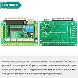 - Features: 1. Fully support for MACH3 and other computer software that supports parallel port control. 2. USB power supply and peripheral power supply are separated to ensure computer security. 3. 12-24V wide peripheral voltage input, with anti-reverse connection function. 4. All input signals are isolated by optical coupling, and can be connected to emergency stop, tool setting, limit, etc. 5. One-way relay output port can control the spindle switch.The output port is P17 port. 6. One-way optocoupler isolated 0-10V analog voltage output can control the inverter with the corresponding analog interface to control the spindle speed.The output port is the P1 port. 7. Open all 17 ports, can be connected with optocoupler drive, can control 5-axis stepper motor. 8. P1 acts as a PWM output and can control the spindle governor with optocoupler input. 9. Can be connected to the common cathode/anode drive with input level of 5V. Package Includes: 1 x 5 Axis CNC Breakout Board 1 x Double USB cable 1 x DB25 Male to Female cable 5 x XH2.54 4P cable