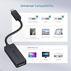 High-Performance HDMI 2.1 Standard: Elevate your visual setup with the Cable Matters USB C to HDMI 2.1 Adapter. This compact adapter brings the latest HDMI 2.1 technology to USB-C, supporting resolutions up to 8K 60Hz and 4K 240Hz on compatible displays, perfect for ultra-high-resolution viewing. Stunning Resolution Capabilities: Connect to the latest 8K and 4K 240Hz gaming monitors and TVs, utilizing this adapter’s ability to transmit maximum video resolution of 8K 60Hz with RGB 4:4:4. Experience high-quality video with no loss in picture quality. Advanced Video and Audio Experience: Supports HDR for vibrant and breathtaking colors, and Auto Low Latency Mode (ALLM) for smooth, lag-free gaming. This adapter is designed for use with USB-C devices that have DP Alt Mode, and it also supports immersive surround sound audio. Designed for Microsoft Surface: Certified by Microsoft's "Designed for Microsoft Surface" program, this adapter ensures reliable compatibility and optimal performance with Surface devices like Surface Laptop 6 and Surface Pro, Copilot+ PC (11th Edition), making it an ideal choice for Surface users seeking enhanced video capabilities. Premium and Durable Construction: Built with robust metal connectors in an aluminum enclosure for long-lasting reliability. The sleek, high-quality finish complements the aesthetics of modern, high-end devices while ensuring consistent performance.
