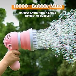 - Sloosh Bubble Gun Toy for Ages 3-8 Boys Girls with Removable Fan, Bubble Solution Refill, Pink Bubble Machine Gun for Kids, Adults, Summer Toys, Party Favors, Easter, Birthday Gift, Outdoor AWESOME SETS: Elevate the bubble fun with our bubble gun for toddlers, kids, adults featuring 1 bubble machine gun,1 water tray for dipping, 2 bottles of 140ml bubble liquid, 12 packs of concentrated bubble solution refills(12ml), 1 Tape-C charging cable, 1 lanyard and 1 hookthe, bubble guns for kids offering a awesome package for a bubbly extravaganza. Portable and entertaining bubble-blowing wherever you go. UNLEASH BUBBLE: Immerse yourself in a mesmerizing display of bubbles with the exceptional feature of producing more than thousands of bubbles per minute, creating a dazzling spectacle for endless enjoyment. Experience durability and reliability with our bubble machine, crafted from shatterproof ABS materials, ensuring a high-quality and long-lasting bubble-blowing experience. 2-IN-1 DESIGN: Our bubble machine gun combines blowing bubbles with a handheld fan. The bubble gun body is made of moldable rubber material. It can be folded by pressing. By rotating the bubble gun wand, the gun body and the handheld fan can be separated. You can enjoy the coolness brought by the fan at any time. The gun body can be hung on your backpack or anywhere you want with our included lanyard and hook. easy to carry. Tape-C Charging Cable: Are you still worried about the old-fashioned rechargeable batteries? Our sloosh bubble gun for kids has a brand new charging method, using a Tape-C charging interface, which does not require you to remove the rechargeable battery, making it convenient, fast and safe, ensuring a high-quality and long-lasting bubble-blowing experience. PERFECT FOR OUTDOOR FUN: Take the bubbles refill gun outdoors or party with our blue bubble guns for kids ages 4-8, creating an atmosphere of joy and playfulness for memorable moments. Prioritize safety and entertainment with our bubble gun, providing a safe and engaging activity that captivates children's imaginations and enhances outdoor play. making them great for bubbles party favors, summer, outdoor toy, Easter, Wedding, Birthday and everyday entertainment.