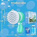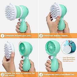 AWESOME SETS: Elevate the bubble fun with our bubble gun for toddlers, kids, adults featuring 1 bubble machine gun,1 water tray for dipping, 2 bottles of 140ml bubble liquid, 12 packs of concentrated bubble solution refills(12ml), 1 Tape-C charging cable, 1 lanyard and 1 hookthe, bubble guns for kids offering a awesome package for a bubbly extravaganza. Portable and entertaining bubble-blowing wherever you go.There may be a previous version (double button) The new version has been integrated into one button with no difference in functionality UNLEASH BUBBLE: Immerse yourself in a mesmerizing display of bubbles with the exceptional feature of producing more than thousands of bubbles per minute, creating a dazzling spectacle for endless enjoyment. Experience durability and reliability with our bubble machine, crafted from shatterproof ABS materials, ensuring a high-quality and long-lasting bubble-blowing experience. 2-IN-1 DESIGN: Our bubble machine gun combines blowing bubbles with a handheld fan. The bubble gun body is made of moldable rubber material. It can be folded by pressing. By rotating the bubble gun body, the gun body and the handheld fan can be separated. You can enjoy the coolness brought by the fan at any time. The gun body can be hung on your backpack or anywhere you want with our included lanyard and hook. easy to carry. Tape-C Charging Cable: Are you still worried about the old-fashioned rechargeable batteries? Our sloosh bubble gun for kids has a brand new charging method, using a Tape-C charging interface, which does not require you to remove the rechargeable battery, making it convenient, fast and safe, ensuring a high-quality and long-lasting bubble-blowing experience. PERFECT FOR OUTDOOR FUN: Take the bubbles refill gun outdoors or party with our Mint bubble guns for kids ages 4-8, creating an atmosphere of joy and playfulness for memorable moments. Prioritize safety and entertainment with our bubble gun, providing a safe and engaging activity that captivates children's imaginations and enhances outdoor play. making them great for bubbles party favors, summer, outdoor toy, Easter, Wedding, Birthday and everyday entertainment.