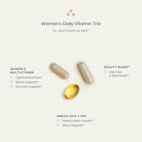 - COMPLETE DAILY VITAMIN TRIO FOR WOMEN: Each convenient pack includes a Women’s Daily Multivitamin, a Beauty Blend, and an Omega DHA + EPA softgel. Developed by doctors, this trio provides nutrients like methylfolate, vitamin B12, vitamin D, and zinc in a thoughtfully balanced formula.