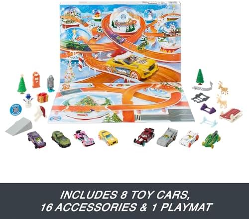 - Open a different door for 24 days to discover a new surprise. Each calendar includes 8 Hot Wheels 1:64 scale vehicles and 16 wintery-themed accessories like a snowplow or tree.