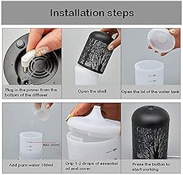 ● 160ml capacity, no need to add water and essential oil frequently, humidify your living space, prevent drying; emit aroma, relieve stress ● 7 colors can be switched, suitable for different environments, creating different atmospheres, super quiet, almost no sound of humidifier work ● When the water level is insufficient/no water, it will automatically shut down to ensure the service life and safety. It is made of BPA-free material ● Small footprint, no restrictions on placement, multi-purpose use, suitable for small space applications, such as study, bedroom, studio, office, home theater ● Retro design, perfect for any decoration of the office or house