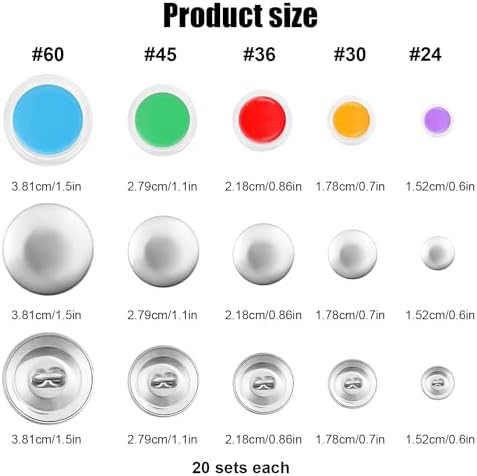- Various Sizes: There is a combination of 5 sizes #24 (0.6 inch/1.52cm), #30 (0.7 inch/1.78cm), #36 (0.86 inch/2.18cm), #45 (1.1 inch/2.79cm), #60 (1.5 inch/3.81cm), 20 sets of each size, which can better help you choose and match different clothes. The quantity is enough for your daily use.