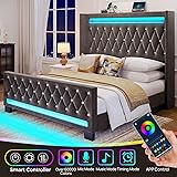 Rolanstar Queen Bed Frame with LED Light and Charging Station, Upholstered High Headboard and Footboard, Wood Slats, Noise Free, Easy Assembly, Grey