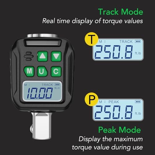- [Tracking /Peak Mode] The track and peak mode can use 1/2 inch to drive digital torque adapter. The rail mode shows the real -time torque value in the use process, and the peak mode will display the maximum torque value during use.