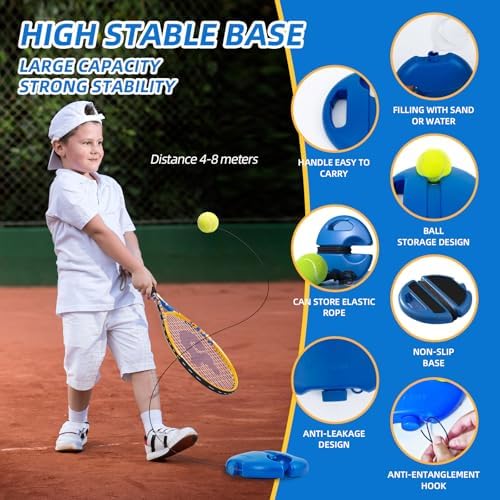 - 【Convenient Design and Happy Training】The portable tennis practice equipment has a groove for placing tennis balls when not in use. It also features a middle part with an annular groove for holding the elastic rope, making it easy to pack without entanglement or knotting. The base can be filled with water or sand to increase weight and securely fix it in place. The anti-skid pad on the backboard enhances stability by increasing friction with the ground