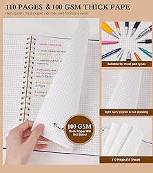 - Hardcover Spiral Graph Paper Notebook: This large 8.5 x 11 grid spiral journal notebook features sturdy and water-resistant plastic hardcover cover, 110 pages, inner expandable pocket, sticker labels, elastic closure band.Premium Paper: Made with high-quality, 100 GSM acid-free paper in light ivory color, our journal graph paper is thicker than average notebooks & writing pads, so you can confidently use most pens, pencils, and markers without ghosting and bleed-through.Sturdy Spiral Wire Binding: Our wire-bound graphing spiral journal notebook has a sturdy gold-color double wire spiral with easy-to-turn pages. Beautifully simple and elegant design makes this graph notebook perfect as a gift especially for friends or families. This grid notebook can lay flat 180° which make it easy to start writing in anywhere.Inner Pocket & Sticker Labels & Remove Ruler: Includes an expandable inner storage pocket to keep track of appointment cards, notes, receipts, and more. Personalize your grid journal cover & spine with the sheet of sticker labels and ruler included.Unique Graph Paper NotebookThe grid paper allows you to express your rich creativity in your daily or monthly graphing journal.Professional Technical DrawingsThe grid provides you an easy way to use grid for measuring sizes and lining everything up nicely.Sketching JournalWith our grid notebook, a nice guide for keeping your handwriting nice and straight.Premium made for everyday Use: Whether used to jot down notes and tasks, brainstorm, engineering notebook, journal or even doodle, thanks to its sturdy cover and premium paper with a perforated edge for easy tear-off, the modern graph notebook is your sturdy companion for a long time to come.