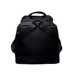 - This Prada re-nylon backpack will elevate your everyday style. It is made of black nylon with Saffiano leather trim. Complete with adjustable shoulder straps and a top handle, this versatile design is perfect for when you're on the go. Effortlessly organize your belongings with two exterior compartments and two interior pockets. Durable and stylish, this signature backpack from Prada is a true staple piece. Model: 1BZ070 Black nylon with saffiano leather trim Silver-tone hardware Enameled triangle Prada logo Single nylon top handle Fold over flap Drawstring and metal buckle closure Two exterior zippered pockets Interior zippered pocket Interior magnetic slip pocket Signature jacquard lining Double adjustable shoulder straps Measurements: 11" x 4.75" x 12" (LWH) Includes authenticity cards and Prada dust bag Made in Italy