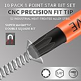 ADVANTAGE OF DYRECELVE: Professional quality authentic tools, an international tool brand, joins 2 million + powered by our leading technology FULL GENERAL SIZE: New packaging with convenient drill bit holder. 10 Pack of double square drill bit set in sizes: #1 (2 in set), #2 (6 in set), and #3 (2 in set). S2 ALLOY STEEL WITH MAGNETIC TIPS: 8 Point star bit with reinforced magnetic heads, providing excellent grip and easy removal. Adopt solid S2 alloy steel, industrial grade hardness HRC60, hardened core increases bit strength improves torque CNC PRECISION ASSEMBLY HEAD: CNC Standard size 8 point torx bit, can be deeply assembled into the screw slot, easy to remove. Also, each drill bit is labeled with its 8 point star bit size WIDELY USED: This Blue 8 point star bit set can be used in a variety of applications, including RVs, trailers, electrical engineering projects, deck screws, dirt bikes, chainsaws, auto parts. It is a must-have tool for professionals and DIY enthusiasts