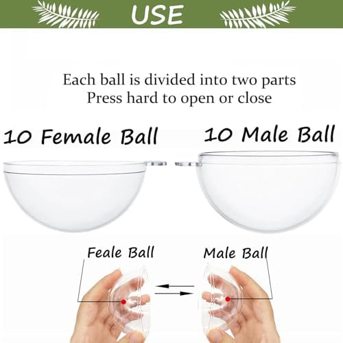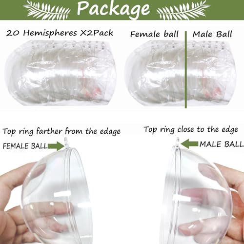 - Size & Quantity: Get 40 half-spheres that transform into 20 transparent balls upon filling. Each ball has an 8cm (3.14") diameter. Please confirm size and quantity before placing your order. (Kindly note: There are 40pcs half balls totally, one ball with 2 opposite sides of a ball, that means 20 male semi-sphere and 20 female semi-sphere half balls. Please make sure you pick one male side and one female side, so that you can match a ball)