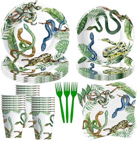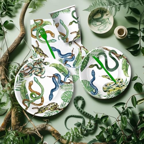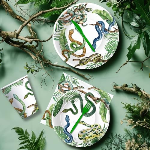 - 【Easy to Clean】Enjoy your reptile theme party to the fullest without worrying about cleaning up with our hassle-free disposable tableware pieces. Spend more time with your loved ones as our snake paper plates and napkins decorations dinnerware for birthday party tableware set can be easily disposed of after the party