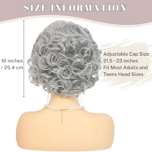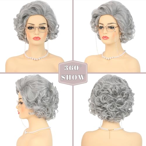 Old Lady Wig Costume Set for Women Short Curly Grandma Wig and Glasses Silver Grey Granny Wigs for Old Woman Cosplay Halloween Party (Silver Grey/Old Lady)