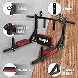 2-IN-1 GYM EQUIPMENT: Yes4All multifunctional wall mounted chin up/ pull up bar mix with dip bar may be used for pull ups and dip ups workouts to target different muscle groups. 515LBS SUPPORT WITH HEAVY DUTY STEEL: This wall-mounted pull-up bar is composed of heavy duty steel, offering outstanding stability and rigidity. It supports up to 515 pounds. VERSATILE STRENGTH TRAINING: This home gym machine is suitable for a variety of sports exercises, including pull-ups, chin-ups, dip stations, push-ups, leg raises, and boxing. Ideal for working out your back, shoulders, chest, arms, triceps, biceps, lats, and the front of your stomach. DURABLE COMFORTABLE CUSHION: Comfortable, tear-resistant, well-padded, high-density back and arm cushions support you as you exercise your upper limbs, chest, waist, and abdomen. EASY TO ASSEMBLE & STORE: 4pcs Strong Suspension Anchors; Concrete brick/ solid cement wall/ solid red brick wall/ solid tile wall are a great surface for mounting this pull up bar; DON'T install on hollow brick wall/ honeycomb brick wall/ drywall/ sandwich panel.