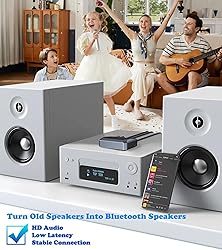 BLUETOOTH WIRELESS AUDIO RECEIVER: The KAIY Bluetooth adapter for old receiver is a compact, lightweight Bluetooth audio receiver that delivers consistent, rich, crystal-clear sound. Stream high-definition audio wirelessly to your sound system and control playlists directly from your smartphone, tablet, computer, or any Bluetooth-enabled device. VERSATILE CONNECTIVITY HUB: The Bluetooth adapter for stereo receiver is simple to install, set up, pair, and operate. With RCA and 3.5mm AUX audio outputs that work simultaneously, you can easily connect the Bluetooth receiver for speakers to any audio system. MUSIC PLAYBACK CENTER: This Bluetooth audio adapter supports three music playback modes: ①Bluetooth Mode, which allows you to stream directly from your phone, tablet, or laptop. ②USB flash drive/TF Card Playback: Play audio directly from USB drives or TF cards. ③AUX Mode: Connect via wired 3.5mm input for maximum flexibility. MAXIMUM WIRELESS FLEXIBILITY: Bluetooth to RCA adapter with the high-performance antenna and the latest Bluetooth Version 5.3 technology, you can stream any audio format and enjoy synchronized, true Hi-Fi digital audio at extended ranges of up to 33ft with no dropouts. NFC TAP-TO-PAIR: The Bluetooth RCA adapter with a built-in NFC chip allows for seamless connection by simply bringing your NFC-enabled smartphone or tablet close to the receiver. Say goodbye to manual pairing processes and enjoy hassle-free connections. VERSATILE COMPATIBILITY: The RCA Bluetooth adapter is ideal for adding quality wireless audio streaming capabilities to sound systems in fitness gyms, schools, classrooms, gymnasiums, houses of worship, restaurants, retail stores, medical facilities, warehouses, hospitality spaces, and business background music systems. CAR-READY BLUETOOTH RECEIVER: Plug the Bluetooth receiver 3.5mm output into your car’s AUX port for wireless audio and hands-free calls. Features one-touch call answering/ending and a built-in mic that suppresses background noise for crystal-clear conversations. IMPORTANT DETAILS: Requires USB power (cable included; AC adapter not included). Bluetooth to RCA works with wired speakers, stereos, and car audio systems (RCA/3.5mm). Not for Bluetooth headphones or TVs.