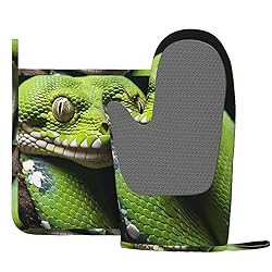 Size: Include One Oven Left Mitts And One Pot Holder. The Kitchen Oven Mittes Sized 7 X 11 Inch,And The Pot Holders For Kitchen Sized 8 X 8 Inch. Our Oven Mitts Heat Resistant Pot Holders For Kitchen Not Only Bring You A Comfortable Touch, But Also Fit A Variety Of Kitchen Decor Styles. Material: Cute Green Tree Python Oven Gloves Hot Pad Is Made Of High-Quality Polyester Fabric, The Soft Quilted Lining Makes It Flexible And Comfortable For Use. The Silicone Design On The Oven, Provide A Secure Non-Slip While Handling Pots And Pans.Make Cooking In Your Kitchen Safer And More Convenient. Heat Resistant: Thicker Oven Mitts And Potholders, Well Protect Your Hands And Wrists From Burns Or Steam Scalds, Whether Removing A Pan From Your Oven,Picking Up A Steaming Pot From Your Stove Or Tending To A Hot Grill,You Can Rest Assured. Easy To Store: The Cute Green Tree Python Kitchen Oven Mitts And Pot Holder Come With Lanyard Design, So It Is Easy To Store And Hang Them Via The Suspension Rings When You Are Not Using, Save Your Kitchen Space And Make Your Kitchen Look More Cleaner And Tidy. Heat-Resistant Gloves And Hot Pads Are A Must-Have In The Home Kitchen. Gift: The Unique And Funny Mitts And Pot Holders,Add More Funs To Your Kitchen When Cooking, And It Is Also An Ideal Gift For Anniversaries, Mother'S Day, Birthdays,Patricks, Easters, Thanksgiving Days, Christmas Days ,Housewarming Etc To Families, Friends, Or Neighbors.