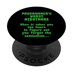 The graphic design features pixelated green text. Ideal for men and women programmers, coders, code writers, web developers who have a great sense of humor and love funny programmer memes, sayings, slogans, phrases, quotes or jokes. PROGRAMMER'S WORST NIGHTMARE When it takes you two hours to figure out you forgot the semicolon. Great present for programming students, programming teachers or programming professors for the classroom, school, university campus, college or hackathon. Adhesive backing attaches the PopGrip to your case or device. Will not stick to silicone, leather, waterproof, or highly textured cases. Works best with smooth, hard, plastic cases. Not compatible with wireless charging Printed top is swappable with other compatible PopGrip models. Just press flat, turn 90 degrees until you hear a click and remove to swap.