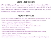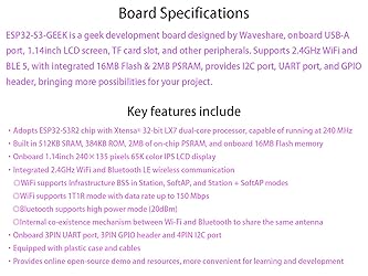 - Introduction ESP32-S3-GEEK is a geek development board designed by Waveshare, onboard USB-A port, 1.14-inch LCD screen, a TF card slot, and other peripherals. Supports 2.4GHz W-i-F-i and BLE 5, with integrated 16MB Flash & 2MB PSRAM, provides I2C port, UART port, and GPIO header, bringing more possibilities for your project. Features 1. Adopts ESP32-S3R2 chip with Xtensa 32-bit LX7 dual-core processor, capable of running at 240 MHz 2. Built in 512KB SRAM, 384KB ROM, 2MB of on-chip PSRAM, and onboard 16MB Flash memory 3. Onboard 1.14inch 240×135 pixels 65K color IPS LCD display 4. Integrated 2.4GHz W-i-F-i and Blue-too-th LE wire-less communication ---W-i-F-i supports Infrastructure BSS in Station, SoftAP, and Station + SoftAP modes ---W-i-F-i supports 1T1R mode with data rate up to 150 Mbps ---Blue-too-th supports high power mode (20dBm) ---Internal co-existence mechanism between W-i-F-i and Blue-too-th to share the same antenna 5. Onboard 3PIN UART port, 3PIN GPIO header and 4PIN I2C port 6. Equipped with plastic case and cables 7. Provides online open-source demo and resources, more convenient for learning and development: bit.ly/41CXoN2 Application Example Suitable for creative applications such as wire-less USB flash drives, USB W-i-F-i/Blue-too-th, USB Dongle based on ESP32-S3, as well as for Introductory Programming Learning, etc. Package Content ESP32-S3-GEEK and cables x1