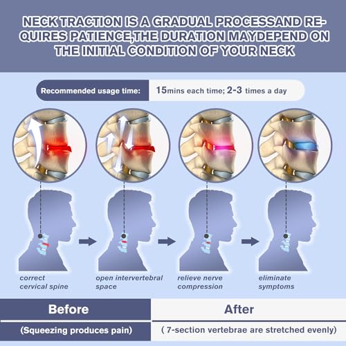 - 3 Power Tractions:The new cervical spine device is improved on the basis of traditional cervical spine fixation, and realizes tightening - pushing up - fixing, three steps in one, maintaining and restoring the cervical spine. At the beginning of use, there will be pain and uncomfortable squeezing feeling. After performing neck exercises 2-3 times a day, each time for 10-20 minutes, the discomfort symptoms such as stiff shoulders and neck, dizziness, etc. will gradually disappear.