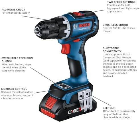 The Bosch GSR18V-800CB24 showcases superior user control and professional durability in a powerful drill/driver. Featuring an efficient and powerful brushless motor, the drill delivers an impressive 565 In.-Lbs. of max torque for heightened performance. The tool is fitted with KickBack Control, which reduces the risk of sudden rotational torque reaction in bind-up scenarios, enhancing safety on the job. A bright, LED worklight illuminates dimly lit spaces for increased visibility on the job, and the switchable precision clutch feature ensures greater control when switched on by stopping the tool when clutch slippage is detected. The compact and ergonomic design provides for improved handling and greater comfort. Two speed settings offer options for both high speed (0-2,100 rpm) and high torque (0-630 rpm), while the 20+1 clutch settings help to tailor the tool to a range of applications. And with an all-metal chuck, the drill/driver was made for optimal durability. The kit includes two CORE18V® 4.0 Ah Advanced Power batteries for optimal productivity and runtime.