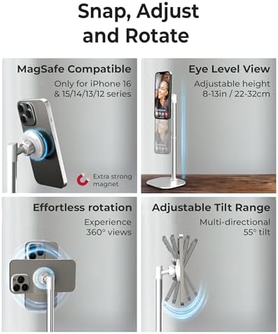 - MagSafe-Compatible Phone Stand for Desk: iPhone holder for desk for iPhone 17 Pro Max (Air), iPhone 16/15/14/13/12, MagSafe cases; perfect magnetic, height-adjustable iPhone holder for filming, FaceTime, Zoom, Facebook Live, TikTok, studying