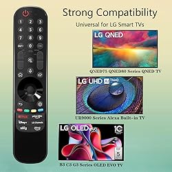 1.GHUST MR23GA Replacement Magic Remote Control for LG C3 B3 G3 UR9000 QNED75 QNED80 Series OLED QNED EVO Smart TV 2.Compatible TV Models: OLED42C3AUA OLED42C3PUA OLED48C3PUA OLED55C3PUA OLED65C3AUA OLED77C3PUA OLED83C3PUA 43UR9000PUA 50UR9000PUA 55UR9000PUA 65UR9000PUA 75UR9000PUA OLED55G3PUA OLED65G3PUA OLED77G3PUA OLED83G3PUA 43QNED75URA 50QNED75URA 55QNED75URA 65QNED75URA 75QNED75URA OLED55B3PUA OLED65B3PUA OLED77B3PUA 50QNED80URA 55QNED80URA 65QNED80URA 75QNED80URA 86QNED80URA 3.Features:Made of high-quality ABS, Precise Control, More Durable,Small and compact size makes this remote control easy to grip and uneasy to slip 4.Convenience:No programming or setup required, just plug in 2 AAA batteries (not included) and start using the replacement Remote 5.After-sales service:If you have any questions about the quality of our products, please contact us and we will solve your problem promptly.