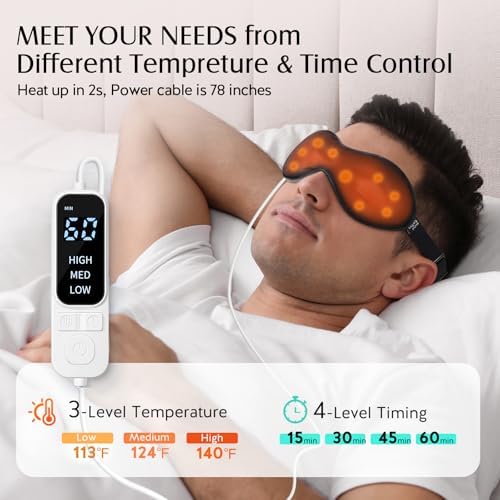 - Adjustable Temperature & Time Settings: Our heated eye mask with heat provides 3 temperatures (113 - 124 -140℉), 4 time settings (15 - 30 - 45 - 60 min), and the auto-off settings tailor the heat level to your preference. Whether you prefer a mild warmth for a quick nap or a higher temperature for deeper relaxation, our dry eye mask allows you to customize the experience for your comfort