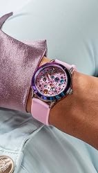 34mm iridescent case 7.5 inch pink strap pink dial mineral glass lens Water resistant up to 30 meters