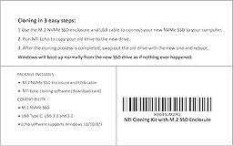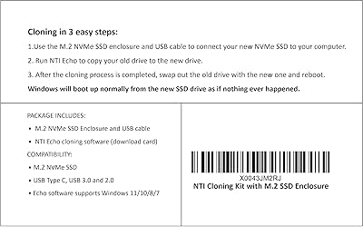 [NEW in V6] Added Windows-mode Cloning, which is more reliable, and supports cloning of BitLocker disks, and RAID disks. NOTE: Most issues reported in user reviews, while definitely solvable had these users contacted our Tech Support, are related to old versions, *not* the new V6. [Dynamic Resize] NTI's trademarked technology, it automatically takes care of different SSD sizes. This feature is essential since you typically clone to a larger SSD. You will not find this feature in a freeware. [Usages] Perfect for M.2 NVMe SSD upgrades. Also good for full system backup, data migration to SSD, and making a duplicate SSD as standby. Compatible with Windows 11, 10, 8.1, 8, and 7. [Versatile] NTI Echo cloning software supports cloning to M.2 SSD (both NVMe and SATA types), 2.5 SATA SSD, and all HDDs. NTI's trademarked "Dynamic Resize" technology enables cloning to a target drive of equal, smaller, or bigger size. [Powerful] Compatible with Windows 11, 10, 8.1, 8, and 7. Able to clone Windows, Linux, Mac, or Windows/Linux/Mac multi-OS partitions* (Please see NOTE below). Your PC installed with NTI Echo becomes your Cloning Station, just connect Source disk and Target disk to the PC and start cloning! [NOTE*] Software installed and run from Windows, able to clone multi-OS partitions with Windows, Linux and Mac OSX. [Package Contents] M.2 NVMe SSD enclosure case, USB cable, USB Type-C to 3.0 adapter, NTI Echo cloning software (Download Card). Cable compatible with USB Type C and USB 3.0/2.0. Enclosure case compatible with SSD size in 2230/2242/2260/2280. [Software] Download instructions and Activation Key are inside the pacakge. Each software license is lifetime. You pay a one-time fee only, this is not an annual subscription! [Notes] (1) Enclosure case is for M.2 NVMe type SSD, not for other types. (2) Does NOT support Dynamic Disks. (3) Software activation requires Internet Access. (4) Please check NTI website for free updates and FAQs.