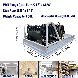- ParameterColor: BlackMaterial:SteelWall Rough Open Size: 27.56'' x 47.24''Max Vertical Height: 9.84ft.Step Size:15.75'' x 5.51''Weight Capacity: 660lbSteps:12Net weight:About 123lbThickness requirements for ceiling openings: minimum 5.12 in, maximum 19.68 inWidth from the Hole Edge to Wall greater-than-equal 1.97 in.Item Included(022699): A Set of Black Loft Ladder Stairs