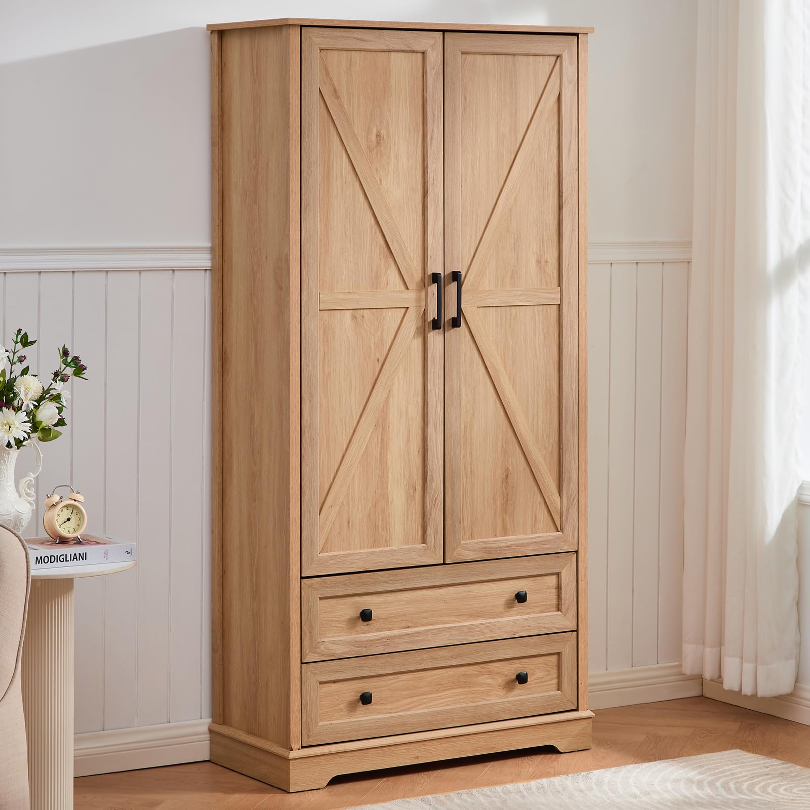 - Farmhouse End Table: This fun and unique style pair a cozy and welcoming farmhouse atmosphere with a rustic and retro industrial feel for that much more chic character. Charming elements include textured finishes and matte metal accents, it adds a charming farmhouse aesthetic and vintage ambiance to your room. 24 Inch Large Tabletop with Charging Station: Design with a 24-inch square large tabletop allows you to place your laptop, cell phone, table lamp, and other daily necessities on the tabletop at the same time and without feeling crowded. What's more, this large end table for living room features AC power within arm's reach located on the top panel, allowing you to say goodbye to the trouble of finding a charging outlet. (2 AC outlets, 2 USB ports) Practical Large Storage Space: The hidden storage cabinet behind the mesh barn door provides extra large storage space, it can hold your storage baskets, daily necessities, receiver, and a large number of books, also store blankets, or even turn into a "safe space" for your pets. Quality You Can Count On: Our storage end table is composed of MDF, particle board, and sturdy metal to provide long-lasting durability and sturdiness. The thickened tabletop (1'') can easily hold up to 110 lbs, and the 3-inch thick support base greatly enhances the stability and load-bearing capacity of the end table. 2-tier shelves can hold 50 lbs and 75 lbs respectively. Easy Assembly: We have prepared clear step-by-step illustrated instructions for this side table with storage and marked them with numbers or letters on each piece of hardware and parts, this makes it easy to find the parts you need. Just simply follow the illustration for each step to find the identically marked parts or hardware and assemble them together, repeat these two simple steps, you can easy to get this side table for bedroom in 30-60 minutes.