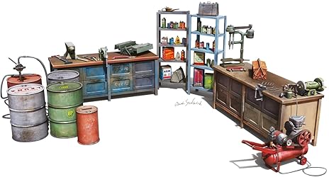 - Kit Garage Workshop in scala 1/48 - Modello Miniart.Il kit include modelli di un'officina-garage con strumenti e accessori.
