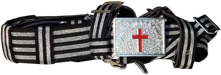 MASONIC KNIGHTS TEMPLAR Ceremonial Sword Belt & Buckle for Sir Knight SIZE Adjustable 36 TO 50 INCHES Knights Templar Sir Knight Black & Silver Sword Belt Black & Silver lace Adjustable sword be Silver plated buckle with the red cross It comes either with Slings or Barrel Chains Customization is Free.