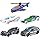 Comicbook hero inspired 1:64 scale toy car set featuring a helicopter and cars.