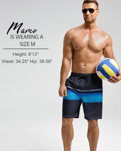 SILKWORLD Mens Swim Trunks 9 Inch Swimsuit with Compression Liner Quick Dry Swimming Surf Bathing Suits, Stripe (Black & Blue Stripes), Medium