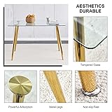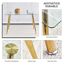 - Modern Dining Table-Designed with simplicity and practicality in mind, this glass and gold dining table with rectangular clear top and Silver Chromium Plated metal legs showcases a modern and elegant look that will go perfectly with your kitchen and dining room.High Quality Tempered Glass Dining Table Top-This stylish dining table is made of high quality tempered glass after careful polishing, the corners are more beautiful with elegant rounded curves, and the thickness is 0.31 inches, thicker and safer.Stable kitchen table-This glass dining table is supported by high quality gold metal legs with thick tempered glass table top, making it more stable and longer lasting.The bottom is equipped with adjustable feet to keep this rectangular dining table stable on uneven floors and not hurt the floor during movement.