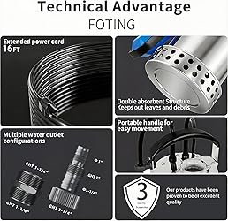 Min. suction level:0.43" Max. grain size:2/5" Max. head:32FT Max. flow rate:4600GPH 【EFFICIENT UTILITY PUMP】 Foting 1HP submersible water pump can discharge up to 4600gallons of water per hour with a vertical lift of up to 32feet. This powerful pump allows you to quickly handle any draining task with ease 【AUTOMATIC FLOAT SWITCH】 Pool draining water pump comes with an automatic float switch that starts working once the water level rises above 7 inches and shuts off once the water level is below 1-1/2 inches, ensuring efficient and energy-saving operation 【MANUAL MODE】You can lock the float switch in the bracket and activate the manual mode. The unit will run continuously without turning off the power, which is useful in case of a failure or to prevent dry running 【EASY TO USE】 Automatic sump pump operates directly when powered on and can remove water down to 0.43 inches. Perfect for quickly draining water from flooded houses, basements, sumps, wells, pools, tanks, spas, and low-lying areas 【FULL STAINLESS STEEL DESIGN】 Water pump is designed with an integrated 304 stainless steel housing and pump base, providing better cooling ability and durability. Its full corrosion-resistant properties and thermal overload protection make it suitable for continuous duty water removal applications 【QUICK INSTALLATION】Submersible pump comes with 2 plastic adapters (GHT1-1/4" adapter and multi-hose adapter) for easy installation. The top discharge design allows for installation in narrow pits, while the double-deck sucking holes on the pump base can filter more debris and handle solids up to 2/5 inch