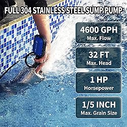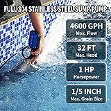 FOTING Full 304 Stainless Steel Sump Pump with Float Switch - 1HP 4600GPH Automatic Submersible Water Pump Fast Water Removal in Pools, Basements, Sewage, Hot Tubs Heater Flush Pit, ponds w/ 10FT Cord