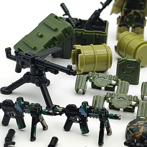- Package Including:Listing includes Camouflage weapon guns, night vision devices, helmets, body armors, tools boxes, Camouflage shields, bomb disposal suits for SWAT figurines, Oil tanks etc, all you will receive as picture show, total 260pcs. Also have building instruction for machine guns and other parts.