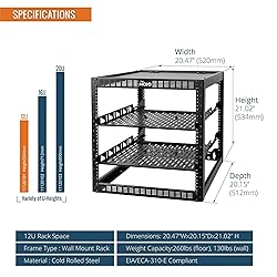 【Powerful Load-bearing】12U Network Rack Open Frame is constructed from durable cold rolled steel; Rack shelf supports enhance stability, wall-mounted capacity of 130lbs, the ground-mounted up to 260lbs 【Considerate Designs】Open-frame layout, including a top panel adding space, anti-slip shelf stops fixing devices and compatible racks for stack and expansion to meet requirements of home server rack 【Complete Accessories】A 12U open frame server rack, two ventilated shelves, four shelf stops, four velcro straps and a set of equipment mounting screws 【Versatile Application】Ideal for space-efficient multi-device setups in warehouses, retail, classrooms, offices and more; Excellent choices as AV Rack/IT Rack 【Effortless Setup】 Network Rack includes hardware, a comprehensive manual, mounting hole drilling template and an online assembly video to simplify setup