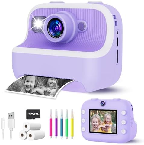 Instant Print Camera for Kids, Christmas Birthday Gifts for Girls Boys, Kids Camera Instant Print with Dual Camera 1080P Digital Camera Toys for 4 5 6 7 8 9 10 Year Old Girl with 32GB SD Card-Purple